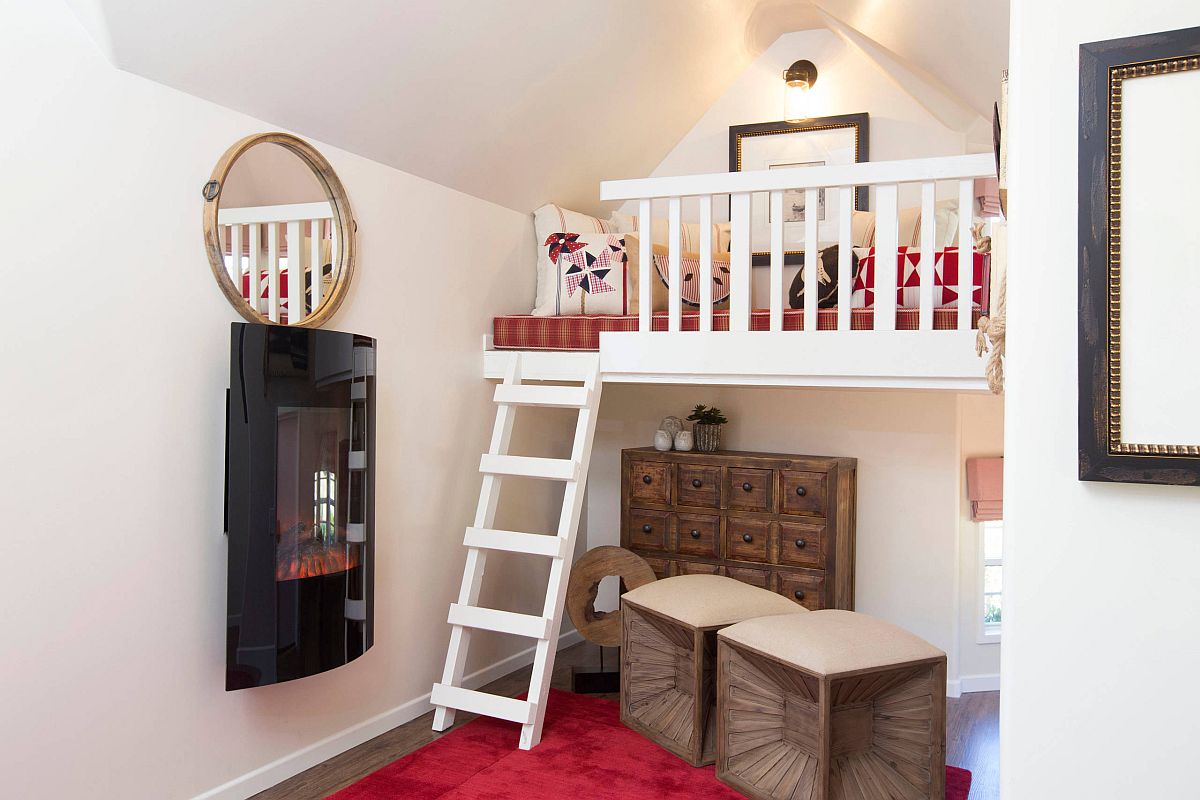 Tường và kệ bằng gỗ mang đến cho phòng chơi một cái nhìn lấy cảm hứng từ cabin mùa hè.